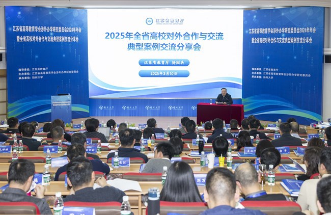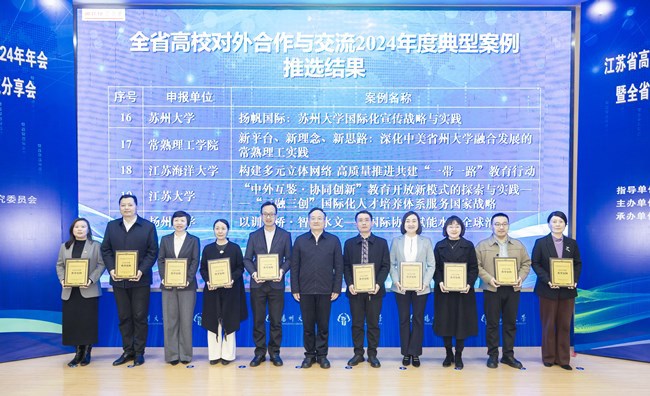 3月10日,全省高校对外合作与交流典型案例交流分享会在扬州举行。本次活动由江苏省教育厅指导,江苏省高等教育学会涉外办学研究委员会主办,扬州大学承办。江苏省教育厅副厅长杨树兵、扬州大学校长刘巧泉等领导出席会议,来自省内高校国际合作与交流相关部门的200余名代表参加会议。开云官网申报的《教随产出 标准引领 平台高端 专业支撑——打造“职教出海”新高地》案例成功入选江苏省高校对外合作与交流2024年度典型案例(本科组)。开云官网国际合作与交流处处长何正英代表学校上台领奖,江苏省教育厅副厅长杨树兵为获奖院校颁奖。