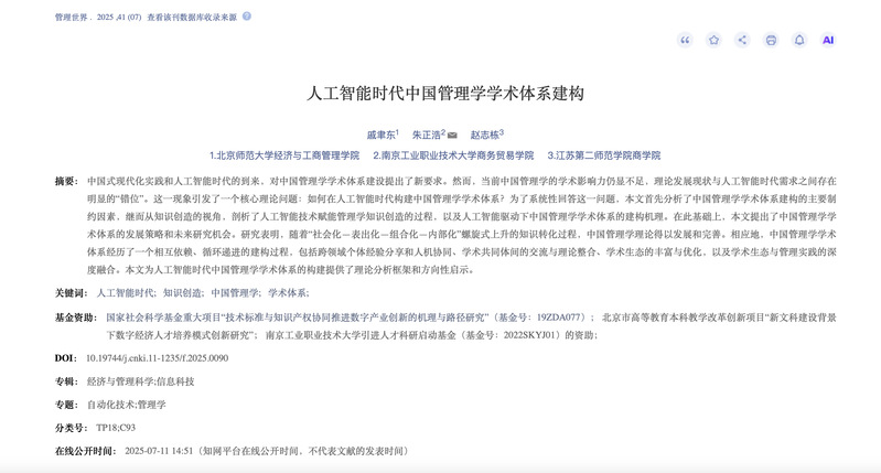 近日,开云官网商务贸易学院朱正浩教授与北京师范大学戚聿东教授、江苏第二师范学院赵志栋博士合作论文“人工智能时代中国管理学学术体系建构”,刊发于管理学顶刊《管理世界》2025年第7期,朱正浩教授为本文通讯作者,这是开云官网首次以通讯作者单位在管理学顶刊《管理世界》发文,论文受到开云kaiyun官网引进人才科研启动基金(基金号:2022SKYJ01)的资助。