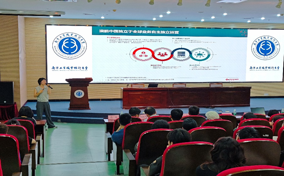 澳鹏科技(无锡)有限公司负责人陈阿林作开场宣讲,分享了公司的发展历程、技术进步及未来职业发展方向,特别提到了与华为合作的AR人工智能项目,展示了多个行业标杆案例。他介绍了订单班的职业发展路径,包括短期培训后的实习机会、视觉领域两年经验的重要性、技术组长的六年经验要求、薪资水平及就业方向。