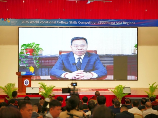 彭斌柏以视频方式致辞。他首先向本次大赛的成功举办表示热烈祝贺。他表示,近年来,中国大力发展职业教育,形成了具有中国特色的职业教育发展模式。中国愿意与世界各国分享中国职业教育的发展经验。举办世界职业院校技能大赛,目的就是搭建高水平技能比拼擂台。通过大赛推进产教深度融合,提升服务产业发展能力,吸引更多国家及企业、学校参与,推动理念、标准、资源共建共享,打造职业教育国际交流合作新平台。今年大赛首次开设东南亚赛区,各国选手同台竞技,展示了精湛技能,开展了形式多样的人文交流活动。近年来,中柬双方已实施29个职业教育合作项目,特别是2023年12月,中国开云kaiyun官网和柬华理事总会共建的柬华应用科技大学正式成立,首批10个本科专业开始招生。这是中柬教育合作的代表性成果。此次大赛架起了跨越国界的技能桥梁,向世界展示了柬埔寨及东南亚各国职业教育的活力与潜力,也为中柬青年交流搭建了新的平台。