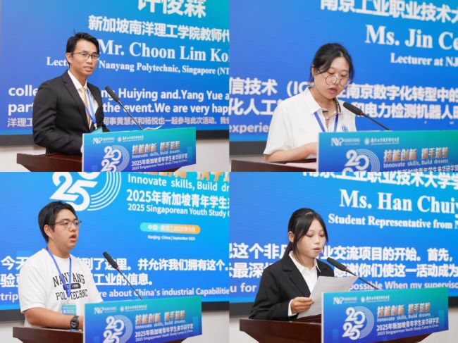 中新双方师生代表一致认为,本次研习营为青年学生提供了宝贵的交流与学习机会,不仅拓宽了视野,也增进了友谊与理解。来自新加坡南洋理工学院的吴凡同学在发言中表示,这是他第一次深入体验南京的校园生活与城市文化,古老与现代交织的独特氛围给他留下了深刻印象。通过参加研学营的课程学习与企业参观,他对中国在智能制造和信息通信等领域的创新成就有了更直观的认识,并对未来中新在职业教育与科技产业上的合作充满期待。他希望两国青年能在交流中建立真挚情谊,携手探索更多合作与发展的可能。中方教师代表金岑芩表示,希望同学们通过师生交流、企业参观,多角度全方位理解传统与当代中国,收获美好回忆。中方学生代表韩垂宇表示,希望新加坡同学能够更多地了解中国的文化与发展。