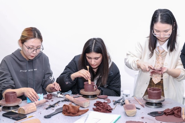 紫砂实践课上,来华留学生在制壶师傅手把手的指导下,试着揉泥、拉坯、刻花纹。一块块紫泥在他们指尖慢慢转动、塑形,仿佛被注入了呼吸与生命。每一件成品,都带着中外交融的审美趣味,成了无声却生动的文化交流的载体。来自埃塞俄比亚的留学生艾美莉举起自己刻了咖啡豆图案的杯子,开心地说:“你看,我把我们那儿的咖啡豆刻在了紫砂杯上,喝的不只是茶,也是两种生活碰在一起的味道。”