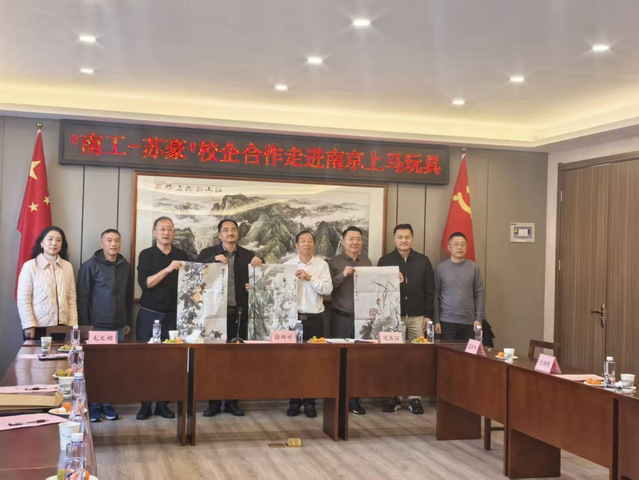毛文娟对“南工—苏豪” 校企合作取得的成果给予高度肯定。她指出,苏豪作为江苏省市场影响力位于前列的500强企业,与南工在人才培养、横向项目、实习就业等方面开展了深入地合作,形成了优势互补、协同发展的良好格局。她希望以此次交流为契机,推动学校“工科+文科”专业群与企业在生产制造、商业运营、艺术设计等领域全面合作,在学生实习就业、教师实践锻炼、产学研项目合作等方面构建长效机制,助力企业创新发展与学校人才培养质量双提升。阮晓文结合自身成长经历,表达了对上马玩具长期发展的敬意,希望双方围绕玩具宠物产业发展、人才联合培养、实践课程教学、实习就业进行深度合作。孙静松向苏豪、弘业、永恒三家企业赠送自己创作的艺术作品以示感谢。会谈结束后,三方人员共同参观了上马玩具的生产车间、研发中心及产品展示区,从原料加工、模具制作到成品组装,详细了解了玩具生产全流程。