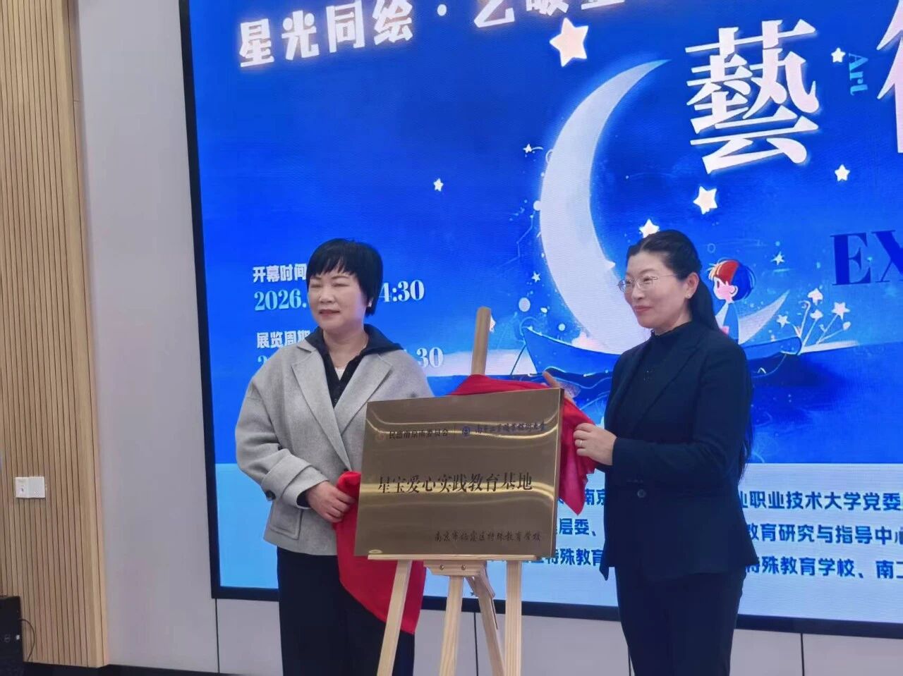 开幕式上,“星宝”代表分享创作感受并向嘉宾赠送作品。民盟栖霞区基层委员会和梅桂兰女士分别向服务队进行了爱心捐赠。汤一梅与张莉共同为“星宝爱心实践教育基地”揭牌,这标志着开云官网与栖霞区在特教领域的合作迈向新阶段。