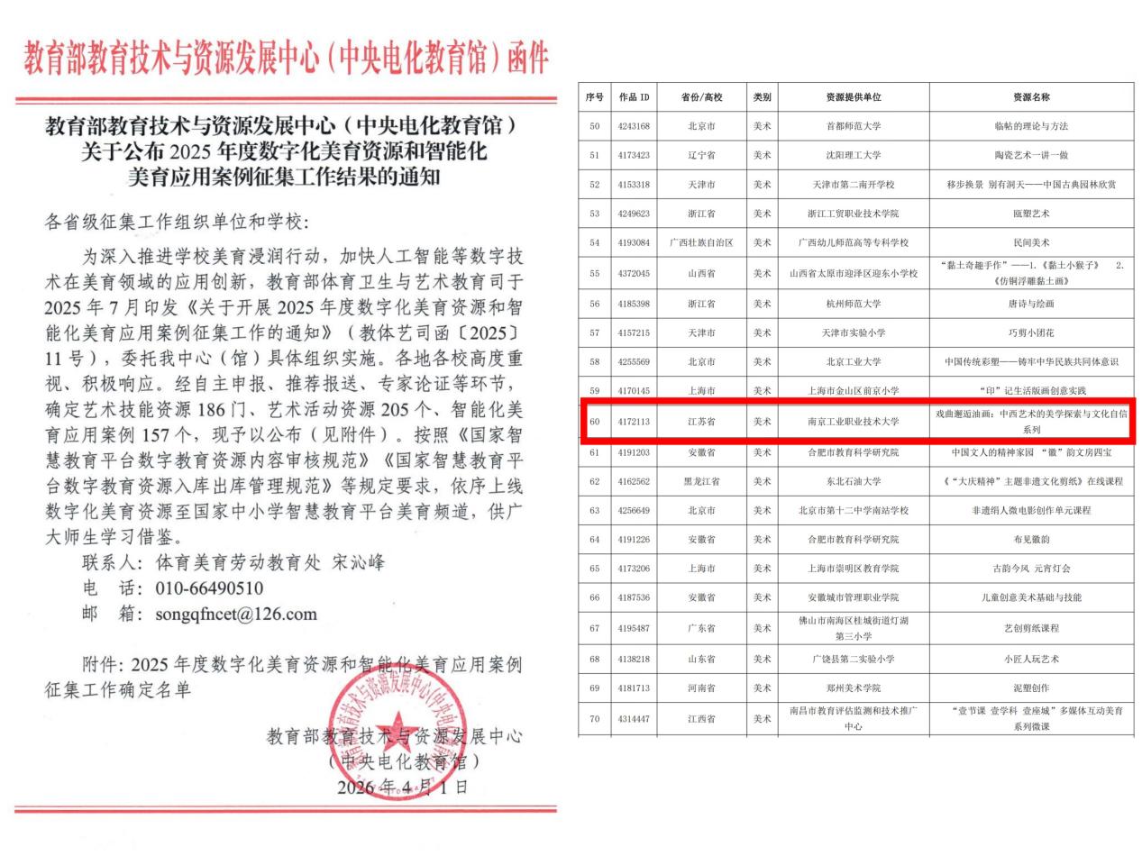 近日,教育部公布2025年度数字化美育资源和智能化美育应用案例征集工作结果,开云官网艺术设计学院教师殷群的艺术技能资源课程《戏曲邂逅油画:中西艺术的美学探索与文化自信系列》成功入选。据悉,全省各级各类学校共30项成果入选,其中9所高校入围。根据《国家智慧教育平台数字教育资源内容审核规范》《国家智慧教育平台数字教育资源入库出库管理规范》等要求,相关数字化美育资源将依序上线国家中小学智慧教育平台美育频道,供广大师生学习借鉴。