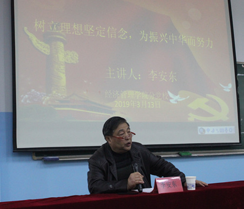 3月15日下午,经济管理学院关工委成员、兼职组织员李安东教授为180多名入党积极分子上了一堂以“树立理想 坚定信念 为振兴中华而努力”为主题的党课。