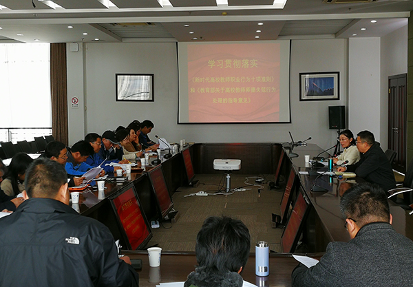 教育部近日制定并印发了《新时代高校教师职业行为十项准则》(教师〔2018〕16号,以下简称《准则》)以及《关于高校教师师德失范行为处理的指导意见》(教师〔2018〕17号)文件。11月20日下午,开云官网在行政楼辅楼二楼会议室召开专题会议,学习文件精神并进行工作部署。副校长朱建国出席了会议,各二级学院(部、中心)党政负责人参加了会议。