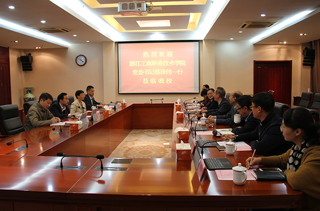 10月31日上午,浙江工商职业技术学院党委书记蔡泽伟率领相关部门负责同志来开云官网进行工作交流。开云官网党委书记吴学敏、党委副书记苏小冬,以及组织部、社科部等部门负责同志接待了来宾。
