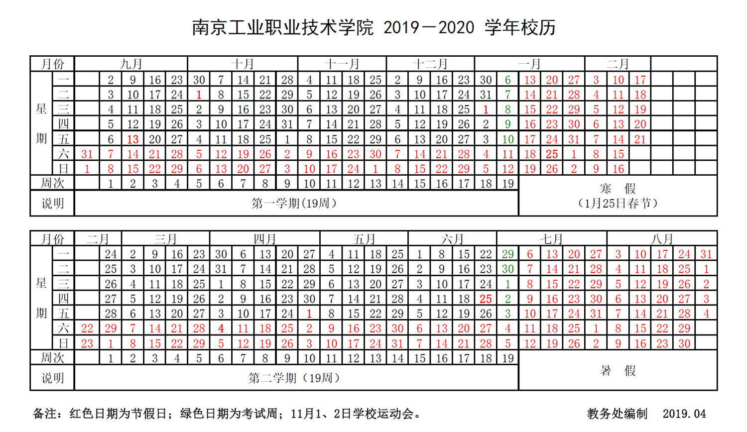 2019-2020学年校历