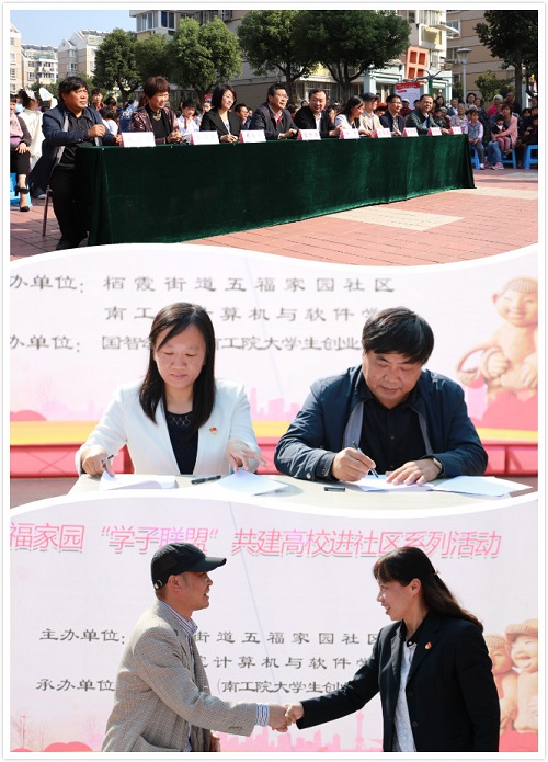 五福家园社区是南京工业职业技术学院大学生社会实践基地。2009年3月南京市栖霞区五福家园社区与南京工业职业技术学院计算机与软件学院团总支(原信息工程系团总支)双方签订《大学生社会实践基地协议书》,至今已深度合作共建十余年。在本次活动的启动仪式中,南工院计算机与软件学院党总支书记刘英慧与五福家园社区党委书记钱文法共同签订“计算机与软件学院党总支与五福家园党委共建协议”,为了更好地立足实际,铭记重托和支持,持续拓展志愿服务活动范畴,打造国智幼育项目,围绕社区文化建设,以非遗技艺相关教学资源为中心,面向6~12岁的少儿,研发适合不同年龄段的传统文化体验课程。