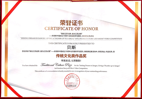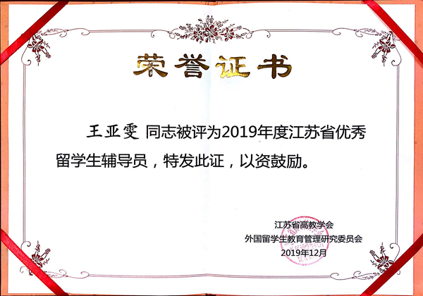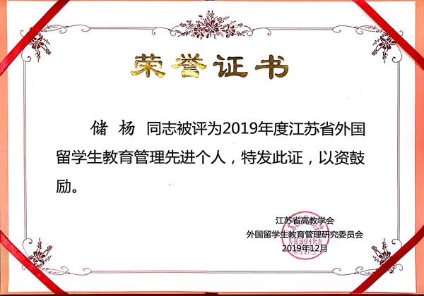 会上,江苏省高等教育学会外国留学生教育管理研究委员会副理事长俞晓南宣读了表彰决定。开云官网国际教育学院储杨老师获得“江苏省外国留学生教育管理先进个人”称号,王亚雯老师获得“江苏省优秀留学生辅导员”称号,贝斯同学获得“我在江苏追梦,我为江苏点赞”——庆祝新中国成立70周年在苏国际学生图文、微视频征集活动“传统文化类作品奖”。