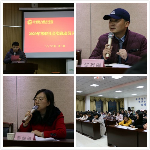 为深入学习贯彻党的十九届四中全会精神,进一步学思践悟习近平新时代中国特色社会主义思想和新时期志愿服务工作的重要指示精神,不断深化实践育人,引导学生在社会实践中受教育、长才干、做贡献,引导青年学生主动走进基层一线,弘扬社会主义核心价值观,亲身感受中央新政策为基层经济社会文化生活带来的新面貌、新气象,引领广大青年学生更加坚定跟党走中国特色社会主义道路的理想信念,结合学院自身优势特色,积极投身全面建成小康社会伟大实践,根据学校《关于组织开展2020年大学生寒假社会实践活动的通知》的精神,计算机与软件学院于1月3日在敬业楼415会议室年举行了寒假社会实践活动动员大会,学院各团支部学生干部参加了本次大会。