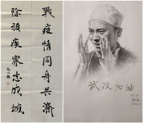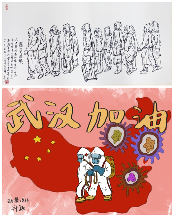 面对新型冠状病毒感染的肺炎疫情带来的严峻形势和艰巨挑战,党员、人民子弟兵、医务工作者纷纷援驰疫区,将赤诚的情怀、顽强的意志和勇敢无畏的中国精神写在中国大地。艺术设计学院组织全院师生用艺术创作向一线战“疫”工作者致敬,全院师生积极响应号召,他们以国画、书法、根雕、平面设计、诗歌、漫画等形式,创作出300余件艺术作品,设计出一幅幅充满温度与祝福的画面,用自己的形式向奋战在一线的医护人员致敬,为武汉加油,为中国助力!
