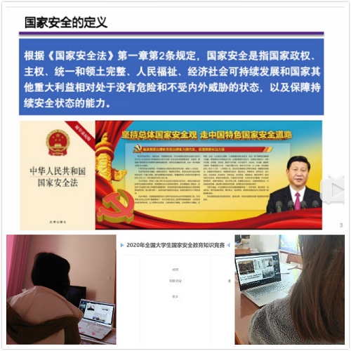 计算机与软件学院组织各班相约“云端”, 通过中国大学生在线、国家开放大学网站及有关在线教育平台,组织学生错峰错时观看2020年全民国家安全教育日高校公开课。通过网络线上的方式开展国家安全教育主题活动,运用创新灵活的手段,切实增强学生维护国家安全的意识和能力。计算机与软件学院团总支充分发挥基层团小组的力量,以团小组为单位围绕课程内容进行深入的讨论,并在新媒体平台发布中国大学生在线的“国家安全知识在线问答”,组织全院学生参与答题,实现全员参与、全员覆盖。同时还结合信仰共公开课重点宣传了在抗疫一线用实际行动维护公共卫生安全、捍卫国家安全的先进典型及感人事迹。