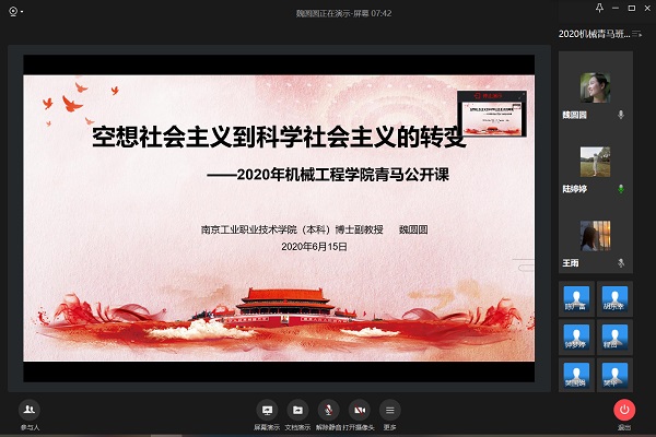 为深入贯彻学习习近平新时代中国特色社会主义思想,深化“实施青年马克思主义者培养工程”,培养一支德才兼备、政治坚定、勇担重任的青年队伍,6月15日,学院邀请了马克思主义学院博士、副教授魏圆圆老师,为学员们开展了以“空想社会主义到科学社会主义的转变”为主题的青年马克思主义者培训班线上公开课。