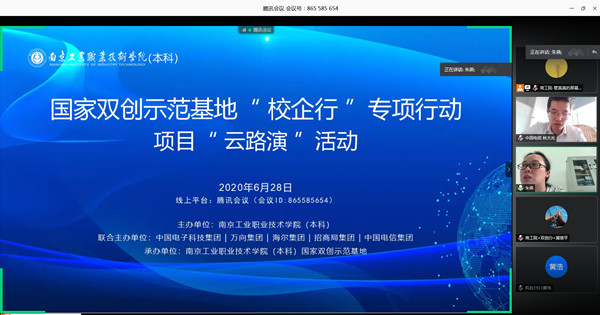 为了贯彻落实国家发改委、国资委、教育部、人社部联合印发的《关于开展双创示范基地创业就业“校企行”专项行动的通知》(发改办高技[2020]310号)要求,加强与企业类双创示范基地的协作和对接,为大学生就业创业营造更好的环境,服务育人工作,6月28日,南京工业职业技术学院(本科)与企业类双创示范基地联合开展“校企行”专项行动项目“云路演”活动。中国电子科技集团、万向集团、海尔集团、招商局集团、中国电信集团等企业类双创示范基地共选派12位创业导师参与本次“云路演”活动。学校创新创业教育工作领导小组办公室主任、创新创业学院院长朱燕出席活动并致欢迎辞。