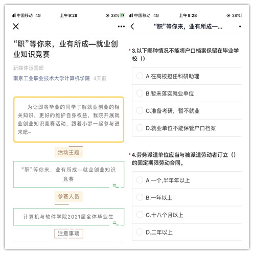 此次竞赛赛程分为宣讲学习、参赛、总结三个阶段,采取扫描二维码或点击学院公众号答题链接网上答题的方式进行。为调动广大学生参加本次知识竞赛的积极性,学院在前期准备阶段为同学们精心编制了内容丰富的竞赛题,将“签订就业协议注意事项”“五险一金”“劳动合同签订注意点”“创业国家政府资助政策”等就业创业基础知识均涵盖在内,帮助同学们进一步掌握就创业知识。