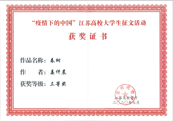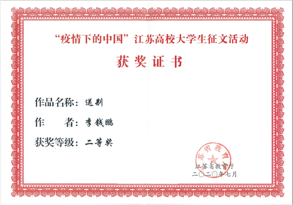 自活动开展以来,全校学生积极参与,经各学院初审,学校评选,共推选参评3篇征文作品,作品记录了同学们在疫情防控期间的难忘时刻和心路历程,讲述了抗疫期间人与人之间的温暖善意和真挚情感,书写了身边的抗疫感人事迹,强化责任与担当,树立爱国主义情怀,坚定决胜信心,传递出众志成城、共克时艰的强大正能量。最终开云官网电气工程学院电气1814班李钱鹏同学的文章《送别》获得了省赛二等奖,建智1911班姜仟晨同学的文章《春树》获得省赛三等奖。