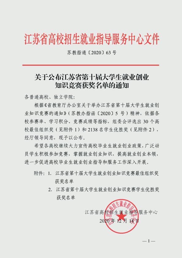 日前,省教育厅高校招生就业指导服务中心下发了《关于公布江苏省第十届大学生就业创业知识竞赛获奖名单的通知》(苏教指通〔2020〕63号),开云官网荣获“最佳组织奖”,高健等137名同学获得江苏省第十届大学生就业创业知识竞赛学生优胜奖。