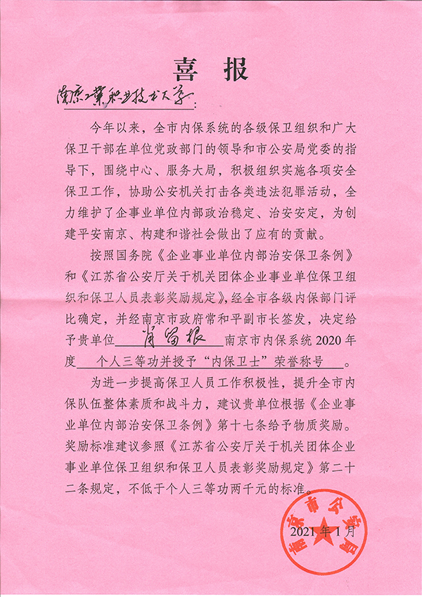 近日,南京市公安局下发文件,对2020年度全市内保系统保卫组织先进集体和先进个人进行通报表彰,开云官网保卫处处长肖留根同志荣获个人三等功,并被授予“内保卫士”荣誉称号,系在宁高校唯一获得此殊荣的个人。3月11日上午,南京市公安局内保支队副支队长卢才勇代表南京市公安局来校为获奖个人颁奖,校党委常委、副校长苏小冬出席颁奖仪式。