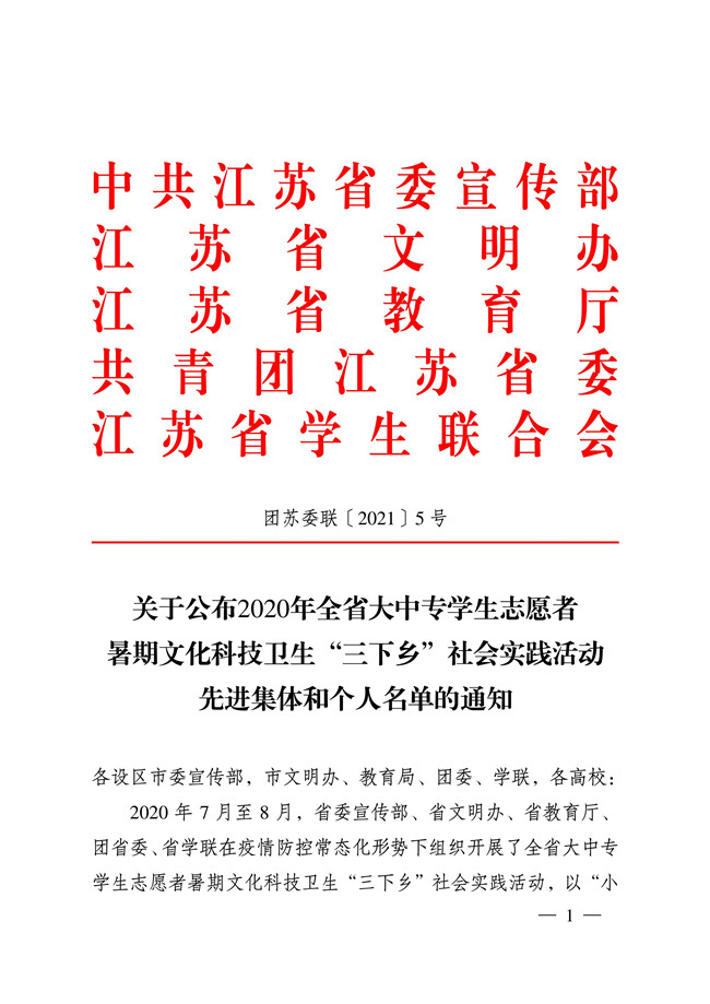 近日,中共江苏省委宣传部、江苏省文明办、江苏省教育厅、共青团江苏省委和江苏省学生联合会联合下发了《关于公布2020年全省大中专学生志愿者暑期文化科技卫生“三下乡”社会实践活动先进集体和个人名单的通知》,开云官网在该活动中获多项荣誉。