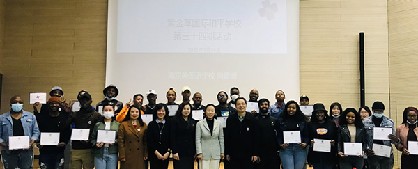 为期半天的学习交流课接近尾声时,留学生们从纪念馆副馆长凌曦手中接过“和平使者”证书。凌曦副馆长鼓励大家参加纪念馆紫金草国际志愿者活动,也希望大家“在未来学习生活中,成为促进世界和平发展的有生力量!”