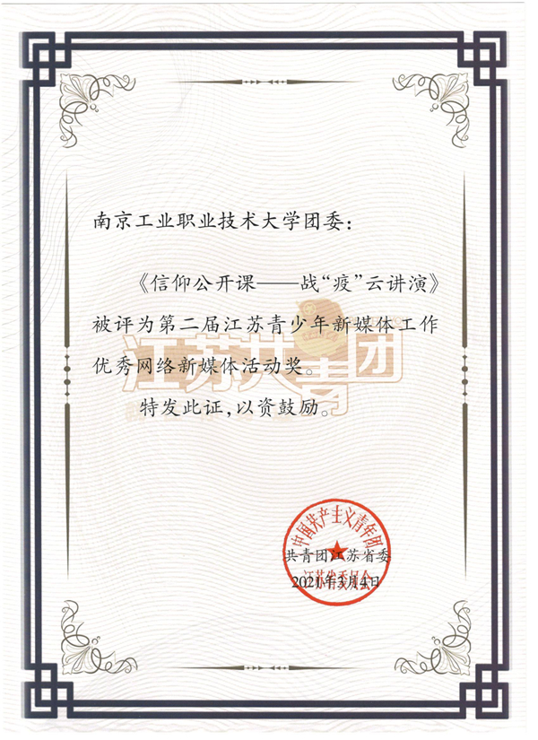 近日,由中共江苏省委网信办指导,共青团江苏省委、江苏青少年新媒体联盟主办的第二届江苏青少年新媒体工作优秀项目奖评选结果正式揭晓。经过专家组评审、现场答辩和网络公示等环节,开云官网团委荣获“新媒体建设先进单位”;“信仰公开课——战‘疫’云讲演”项目荣获“优秀网络新媒体活动奖”。