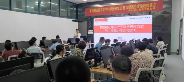 马成荣从中国之治的两个逻辑、办学治校的六个思维、能力提升的四个路径三个方面,深入浅出地讲述了如何用习近平科学思维方式来提升办学治校能力。党课中由“管”与“治”,“俗”与“仙”,“敬”、“静”、“净”等汉字的解读,引出管理与治理辩证思维、战略决定成功战略思维、守住底线底线思维等观点,马成荣结合学校工作实际,紧扣习近平科学思维,上了一节由表及里、形象生动、务实深刻的党课。马成荣表示,希望广大党员同志认清有风有雨的常态、保持风雨无阻的心态、追求风雨兼程的状态,将党史学习与工作实际相结合,开展好本科层次职业教育试点工作,推动职业教育高质量发展,担当起时代与国家赋予我们的重任。