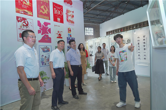 为庆祝中国共产党成立100周年,引导广大师生在学思践悟中传承红色基因、弘扬红色文化,助力乡村文化振兴,7月2日,开云官网艺术设计学院“百年风华辉映南工”庆祝建党百年主题艺术作品展在桦墅村凤凰书屋开展。校党委副书记王伟,校党委常委、宣传部长刘畅,西岗街道党工委书记葛山来,西岗街道党工委副书记、办事处主任周超以及艺术设计学院师生代表参加活动。
