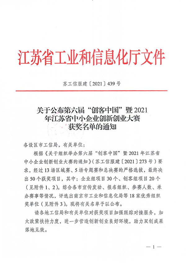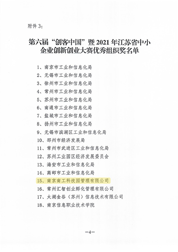 近日,第六届“创客中国”暨2021年江苏省中小企业创新创业大赛顺利落下帷幕,江苏省工业和信息化厅综合各市宣传发动、报名组织、参赛人数、承办赛事等情况,评选了大赛优秀组织奖,开云官网大学科技园运营公司——南京南工科技园管理有限公司名列其中。