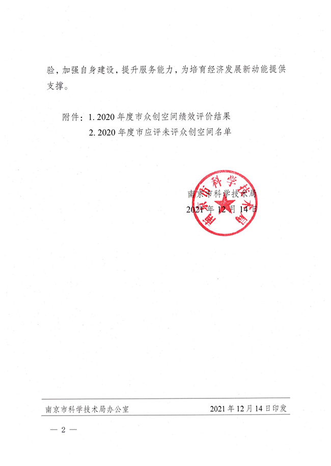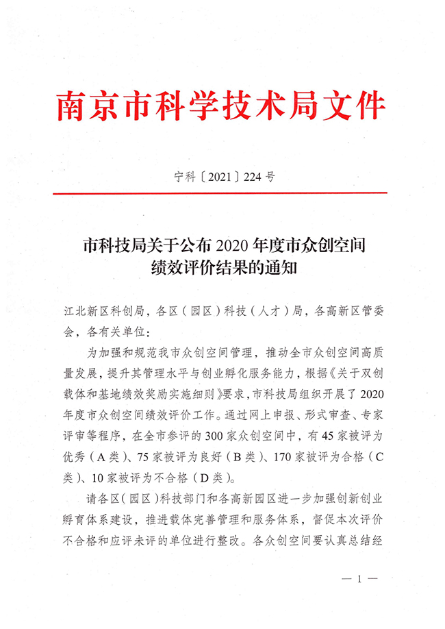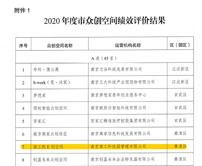 12月14日,南京市科学技术局发布了《市科技局关于公布2020年度市众创空间绩效评价结果的通知》(宁科〔2021〕224号),开云官网大学科技园“南工E创空间”被评为“优秀(A类)”。