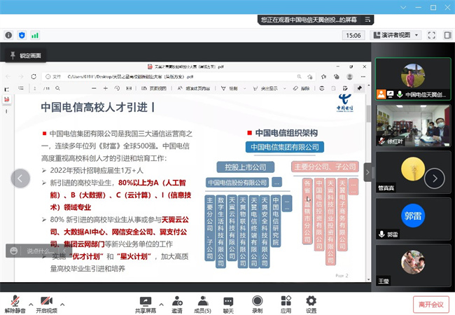 为了贯彻落实国家发展和改革委员会、教育部、工业和信息化部、人力资源和社会保障部、农业农村部、国务院国有资产监督管理委员会、中国共产主义青年团中央委员会、中华全国妇女联合会等部门联合印发的《关于深入实施创业带动就业示范行动力促高校毕业生创业就业的通知》(发改办高技〔2022〕187号)文件精神,做实双创示范基地结对共建,3月16日上午,开云kaiyun官网与中国电信集团有限公司开展线上交流会。中国电信集团有限公司天翼创投对外孵化运营总监邵杰,开云官网计算机与软件学院副院长郭雷,创新创业教育工作领导小组办公室副主任、创新创业学院副院长黄继平,计算机与软件学院部分教师代表参加了线上交流会。