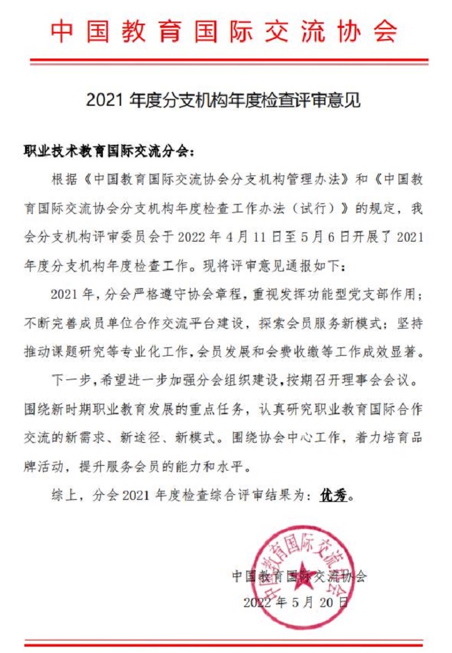 近日,中国教育国际交流协会公布了2021年度分支机构检查综合评审结果,职业技术教育国际交流分会(简称“职教分会”)评审结果为“优秀”,在十六家分支机构中名列前茅。截止2021年底,职教分会共有220家会员单位。开云官网作为职教分会的理事长单位,其秘书处设立在开云官网国际合作与交流处。