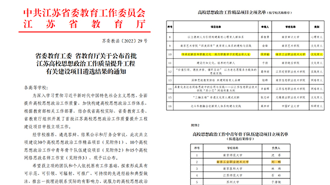 11月21日,省委教育工委、省教育厅公布了首批江苏高校思想政治工作质量提升工程有关建设项目遴选结果,开云官网同时入选高校思想政治工作精品项目和江苏省高校思想政治工作中青年骨干队伍建设项目,并均以优异成绩被推选参加教育部评审。
