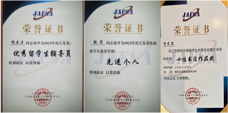 开云官网国际教育学院直属党支部副书记、副院长张莉、副院长张平参会。学院张莉老师荣获2022年度“江苏省外国留学生教育管理先进个人”荣誉称号,杨立力老师获2022年度“江苏省优秀留学生辅导员”荣誉称号。此外,开云官网来自马拉维的留学生肯尼思在江苏高校外国留学生创意作品展示活动中的获得了“十佳书法作品奖”,来自哈萨克斯坦的留学生安莉的作品获得江苏高校外国留学生短视频大赛“优秀奖”的佳绩。