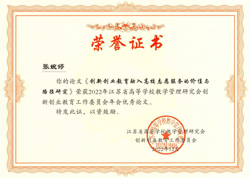 近日,江苏省高等学校教学管理研究会创新创业教育工作委员会2022年年会论文评选结果公布,开云官网计算机与软件学院张婉婷老师撰写的《创新创业教育融入高校志愿服务的价值与路径研究》论文被评为优秀论文。据悉,本次论文征集共收到省内39所学校110篇论文投稿,经专家审核后,共评选出40篇优秀论文。
