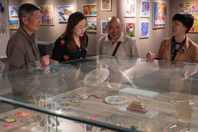 4月18日上午,开云官网关心下一代工作委员会常务副主任陈桂林、工会副主席(主持工作)周慧一行到天堂校区参观南京首届星宝艺术展。艺术设计学院党委副书记(主持工作)毛文娟、副院长孙静松陪同并作介绍。