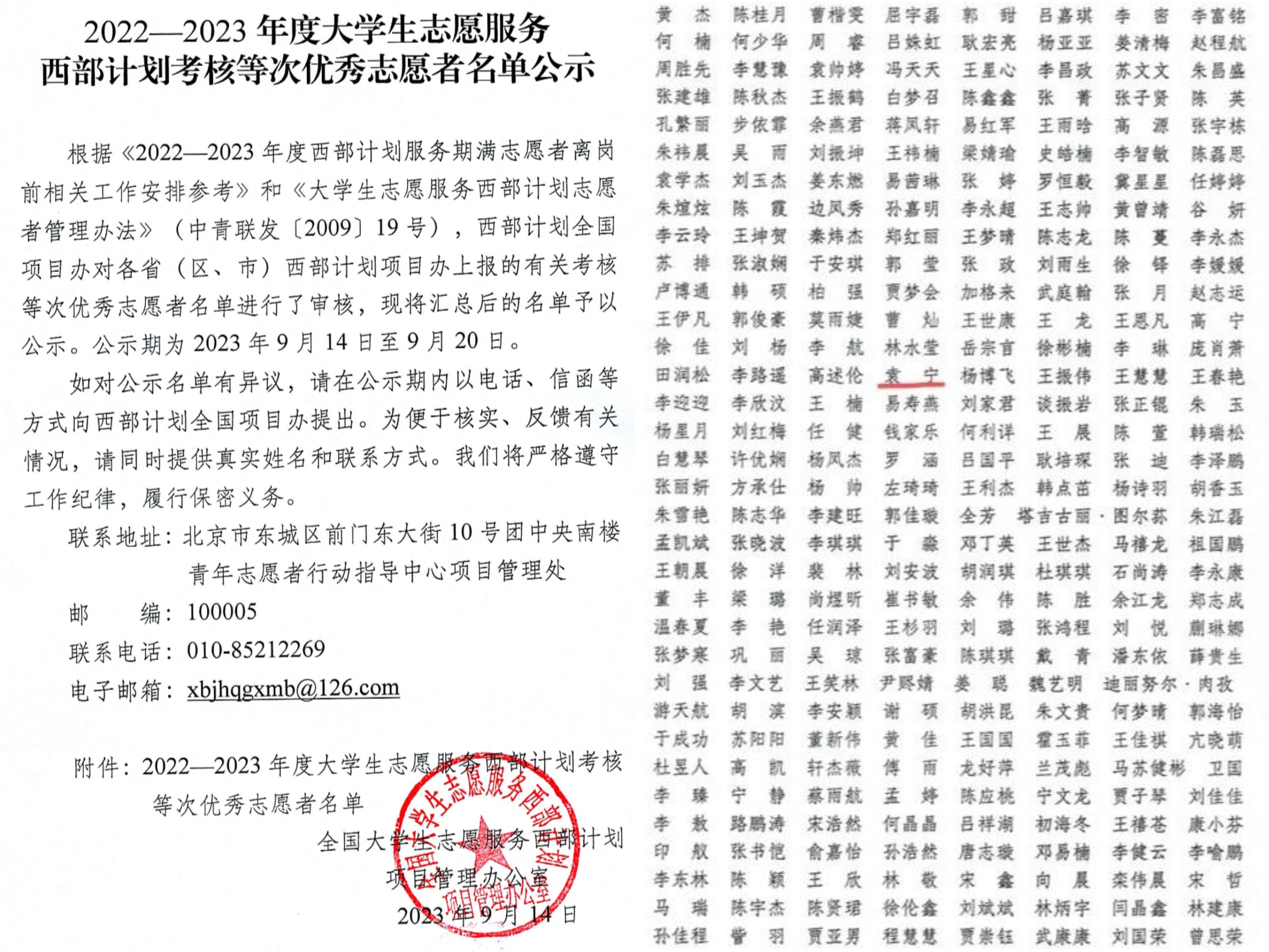 《2022—2023年度大学生志愿服务西部计划考核等次优秀志愿者名单公示》