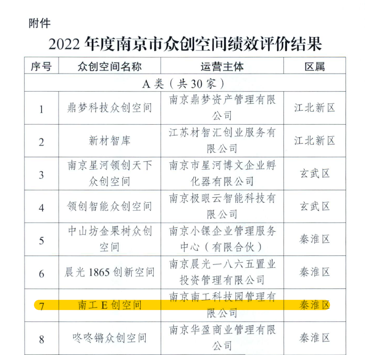 近日,南京市科学技术局发布了《市科技局关于公布2022年度市众创空间绩效评价结果的通知》(宁科〔2023〕56号),开云官网大学科技园E创空间被评为“优秀(A类)”。