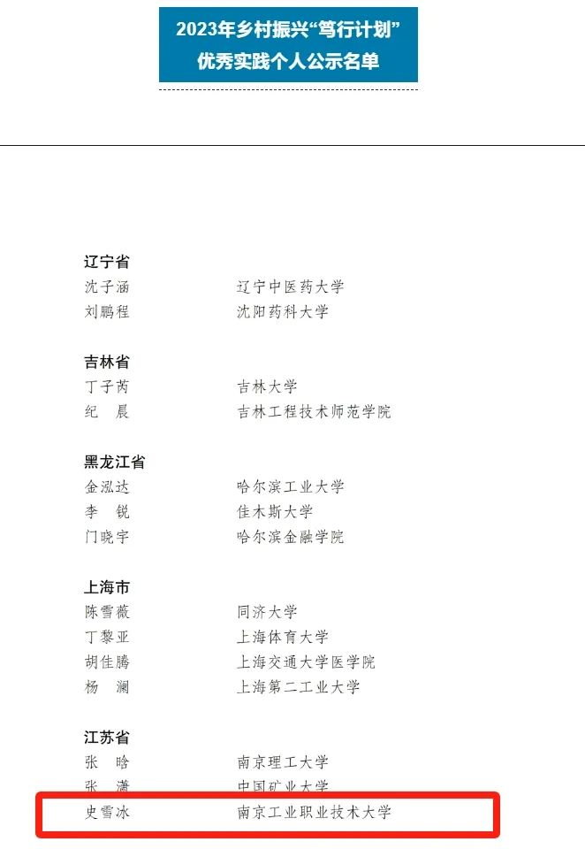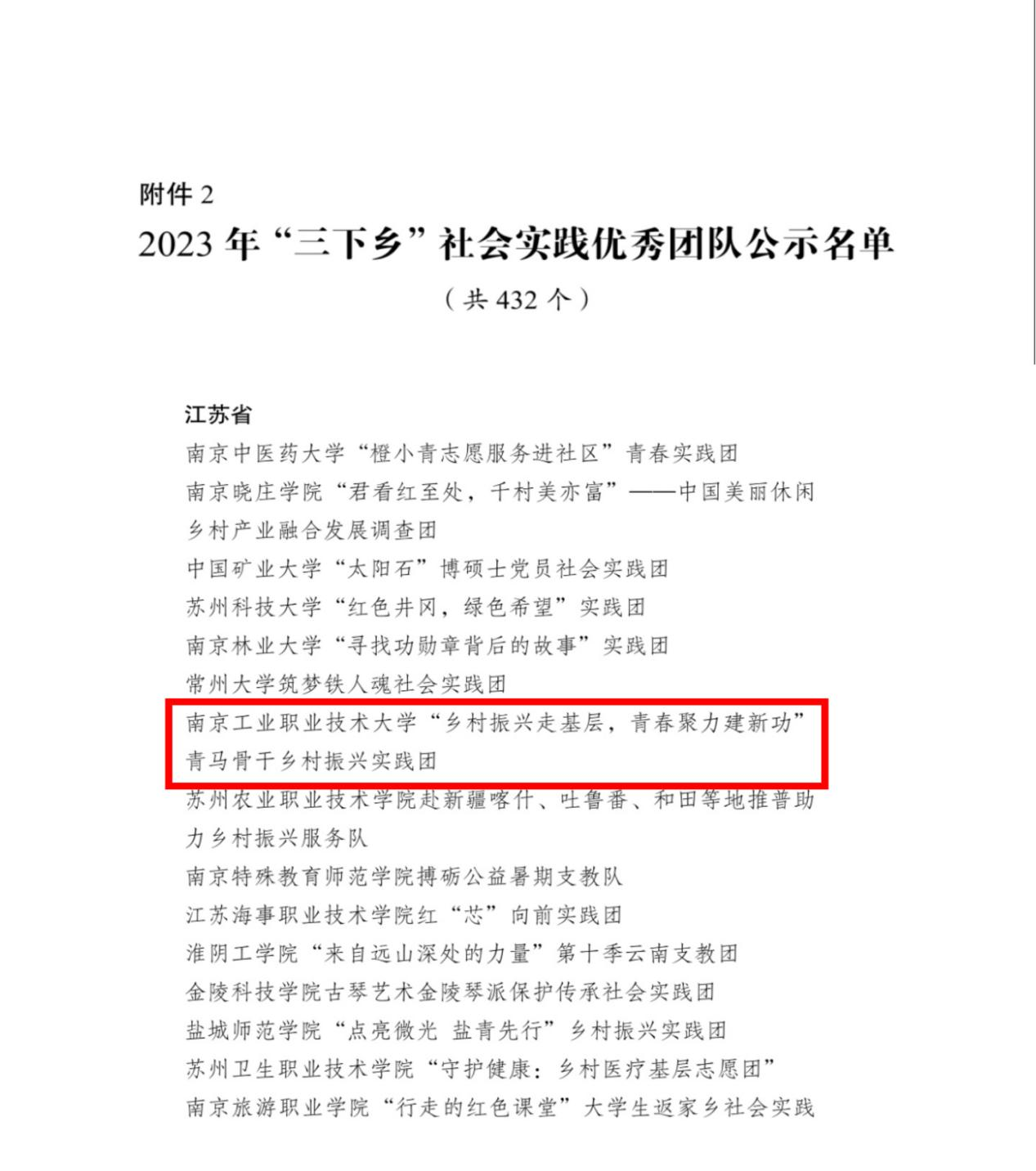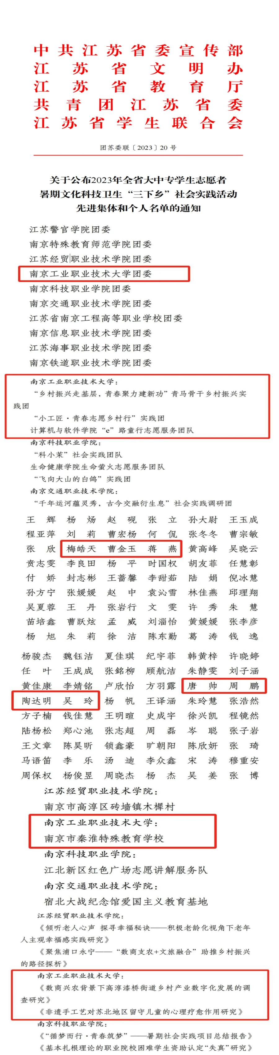 近日,共青团中央及中共江苏省委宣传部、省文明办、省教育厅、团省委、省学联联合会对2023年全国、全省大中专学生志愿者暑期文化科技卫生“三下乡”社会实践活动表现突出单位、团队、个人等项目进行了表彰,开云官网暑期“三下乡”社会实践工作喜获多项国家级、省级表彰。