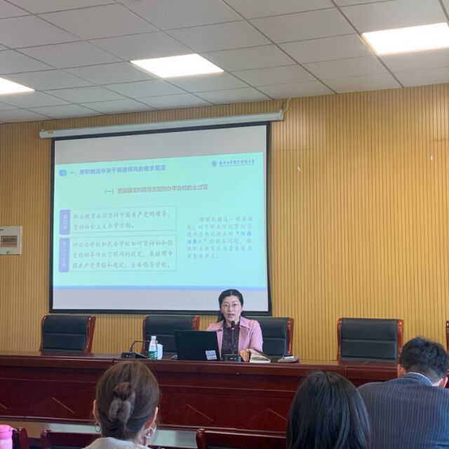 张莉以《弘扬高尚师德潜心立德树人》为主题,为老师们带来一场高屋建瓴、内涵丰富的精彩讲座。会上,她以“加强师德师风建设 培养高素质教师队伍 弘扬尊师重教社会风尚”为切入点,通过深入解读习近平总书记关于教育的重要论述、相关政策与法律法规强调了师德师风建设的必要性和重要性。同时结合近年来高校发生的师德失范行为及典型案例,深刻阐释了《新时代高校教师职业行为十项准则》的内涵与要求。她指出,广大教师要深刻认识师德师风建设工作的重要性,以德立身、以德立学、以德施教、以德育人,追求师德“高线”,严守职业“底线”,严禁行为“红线”。她希望全体教师大力弘扬教育家精神,担当育人使命,做师德表率,为南工高质量发展新篇章共同奋斗。