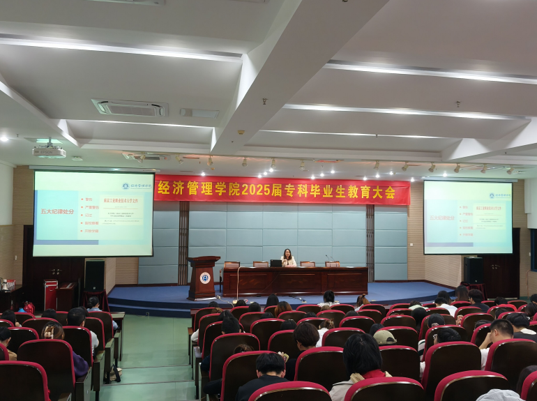 为进一步做好毕业生的学业指导,助力毕业生高质量就业,10月23日下午,经济管理学院在学术交流中心报告厅召开2025届专科毕业生教育大会。学院党委副书记、副院长常敏,教学办秘书胡朴,辅导员严潇睿、洪蕾、胡健和全体2025届专科毕业生参加了会议。会议由严潇睿主持。